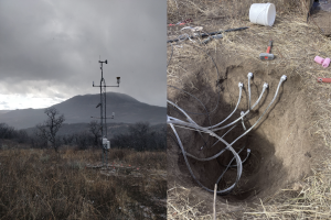 Left: The newly installed ELK station overlooking Elk Mountain, near Steamboat Springs, amid a light snow flurry. Right: The ELK soil pit prior to backfilling, showing the soil temperature/moisture sensors.
