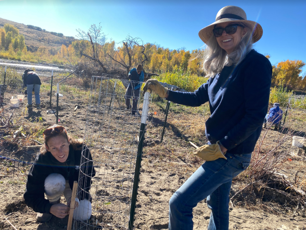 Joanne Orce, kneeling, and Ann Feldman, another Insight artist, planting trees during ReTree along the Yampa River.