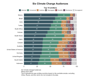 Figure 1: This chart shows the percentage of citizens in each climate change audience in the top 15 greenhouse gas emitting countries (excluding China, Russia, and Iran).