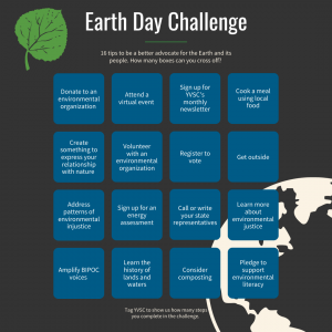 This year, as President Biden has pledged to reduce emissions by 50% by 2030, remember that the call for continued climate action lies with communities, and actions on the individual-level only stand to increase the salience of climate action. So, join YVSC in completing as many of the actions in our Earth Day Challenge as you can, and tag YVSC on Facebook or Instagram to show us how many you’re able to complete.